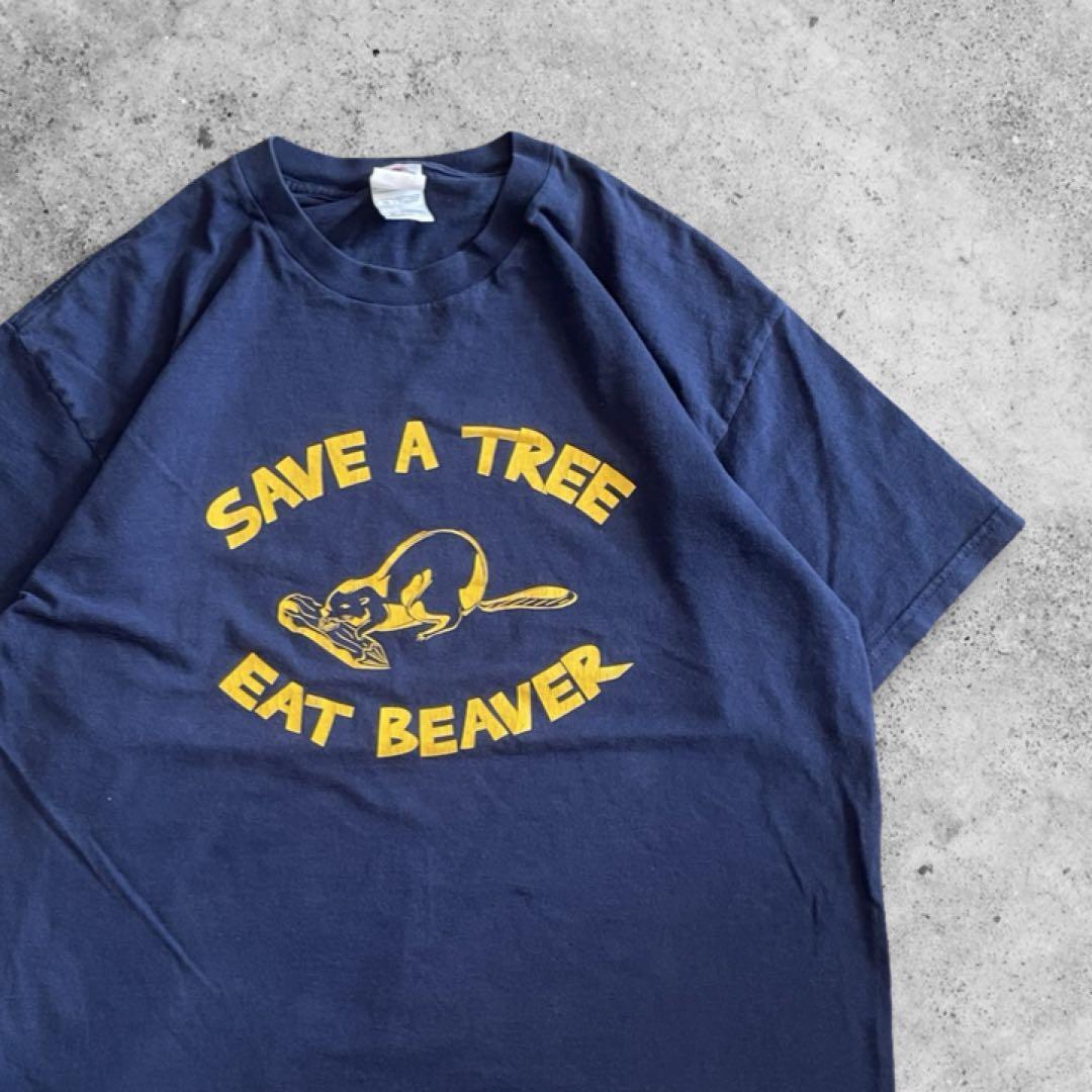 ネットで調べるとSAVE A TREE EAT A BEAVERというプリントが施されたtシャツが多数出てきます。出品者は詳しくないですが、アメリカのことわざなどなのでしょうか?