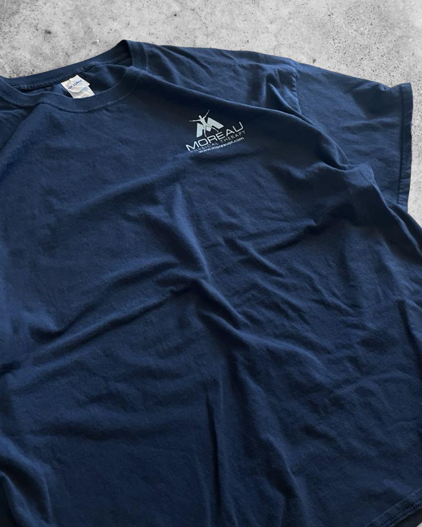 企業ロゴでしょうか。MOREAU PHYSICAL THERAPY というエンブレムのようなプリントが入っています!表面はワンポイント、背面にはバックプリントが入っています。