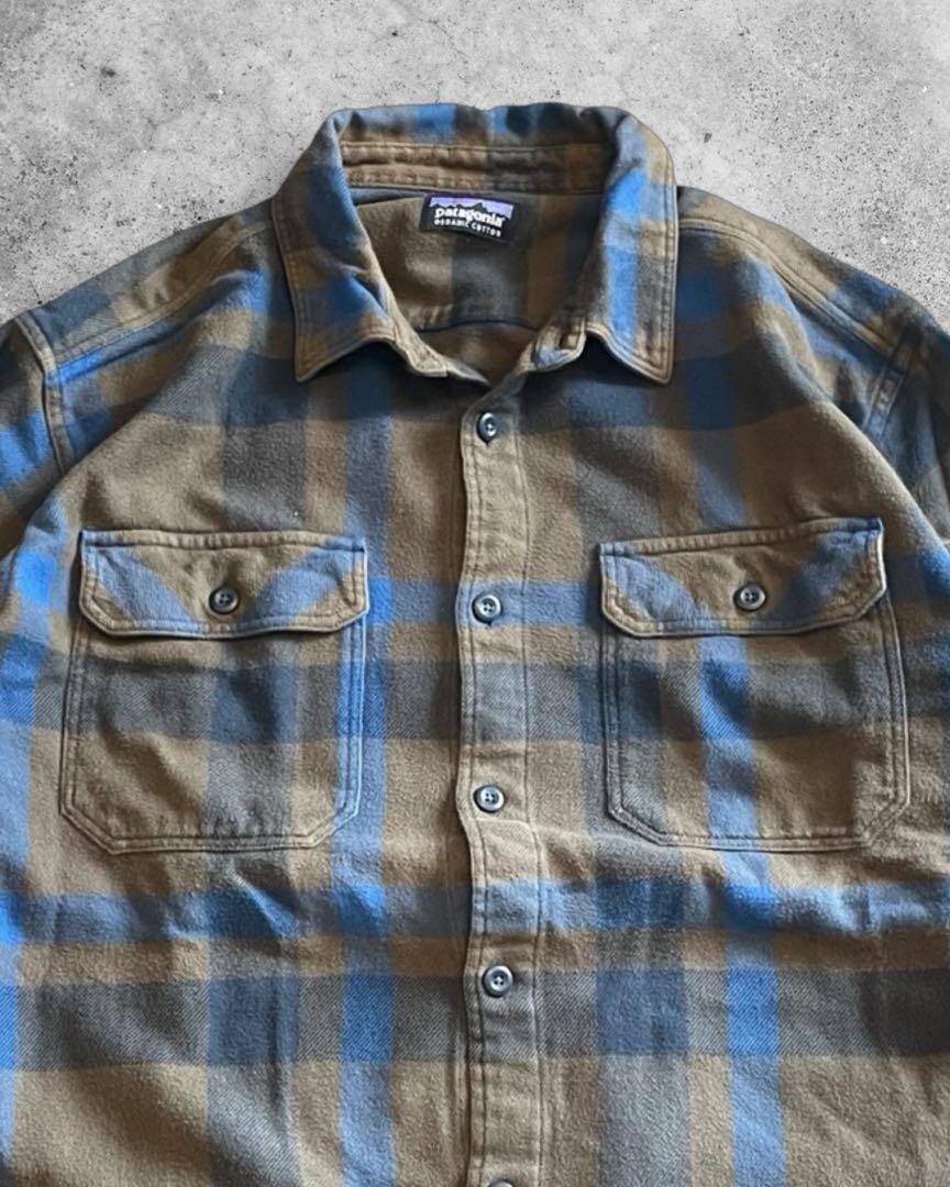 最近人気、価格ともに急騰中のパタゴニアのチェックシャツの出品です。ブラウンにブルーのミックスでとても良い雰囲気です!