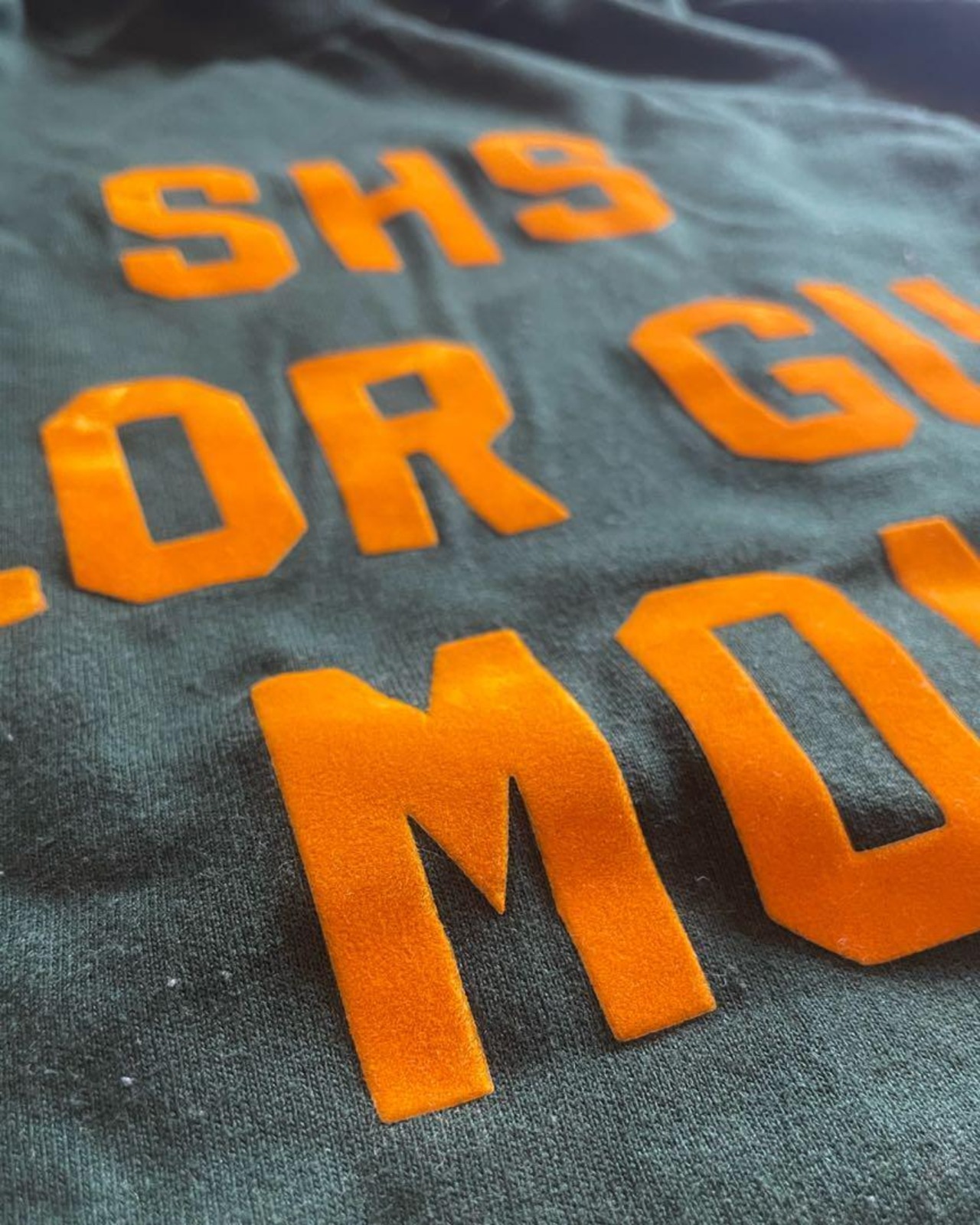 JARZEESのグリーン(緑色)ボディーのTシャツで、前面に「SHS COLOR GUARD MOM」、背面に「GOOD LUCK JACLYN」とプリントされたTシャツです。