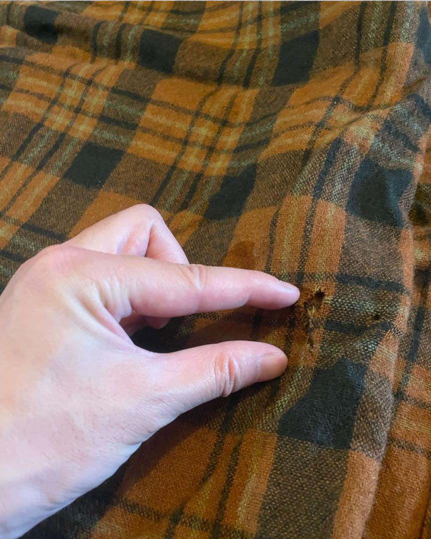 背面の右側面あたりに穴空きがございます。写真にてご確認をお願いいたします。その他、汚れ・破れ・ホツレなどの商品不備はございません。