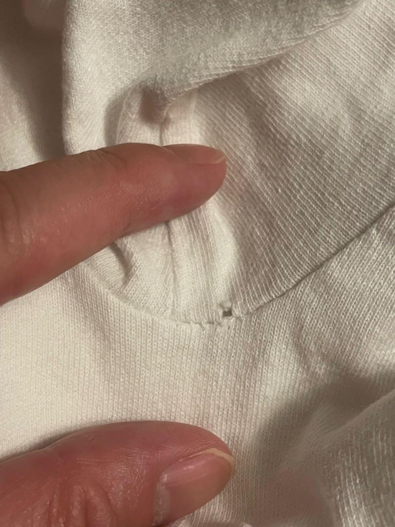 汚れ・破れ・ホツレは見当たりません。右わき下に1ミリ程度の穴あきが確認できます。また襟のリブに若干の擦れがありますが着用には問題ございません。