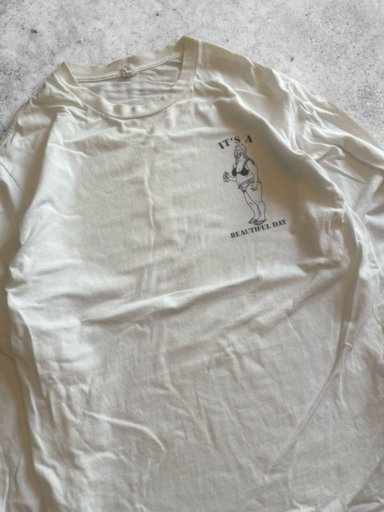 IT'S A BEAUTIFUL DAYとメッセージが描かれており、ポッチャリおばさんが黒ラベルらしき缶ビールを持ってこっちを見ています。とてもシュールで良いですね。