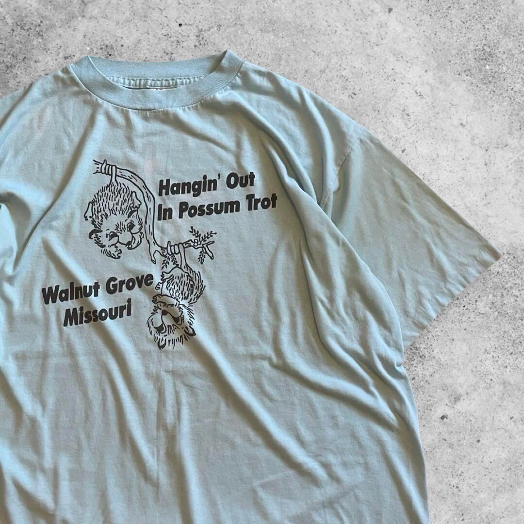 「Hangin' Out In Possum Trot Walnut Grove Missouri」というメッセージが書かれたTシャツになっています。「ミズーリ州ウォルナットグローブのポッサムトロットでぶらぶら過ごす」みたいな意味なのでしょうか。