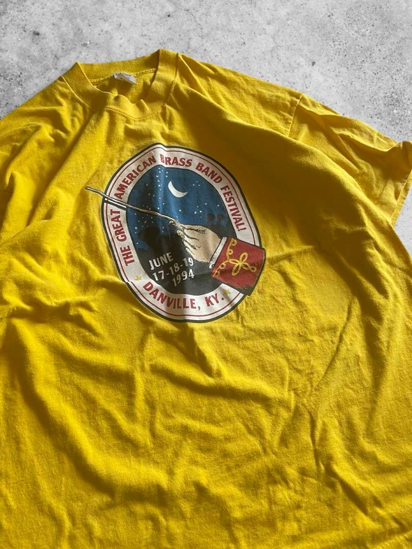 グレートアメリカンブラスバンドフェスティバルというイベントのTシャツです。1990年からケンタッキー州ダンビルで毎年6月に開催される音楽祭です。野外フェスティバルでは、さまざまなブラスバンド、熱風バルーンレース、ピクニックなどのアクティビティが行われます。