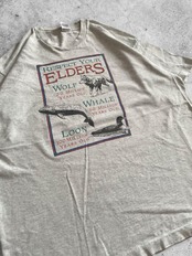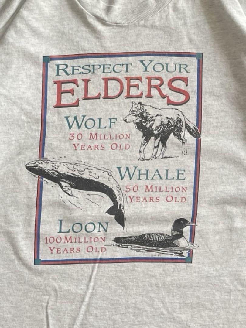 直訳ですが、「RESPECT YOUR ELDERS(年長者に敬意を払う)」と書かれており、その下に「オオカミ3000万年前」「クジラ5000万年前」「アビ1億年前」と書かれています。調べたところ人類誕生は700万年とのことなので我々の先輩たちが描かれているというわけですね。とても良いです。