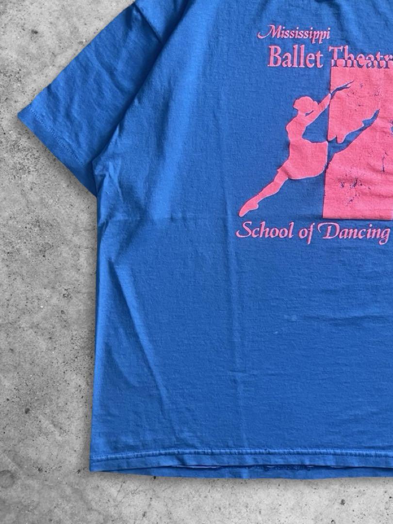 ミシシッピバレエシアターについて調べると、バレエ・ダンス教室のようです。ユニホームなのか保護者Tシャツなのかは分かりませんが、グッドデザインで色合いもとても可愛いです!汚れも背面のため気になりません。古着のいい味が出ております。