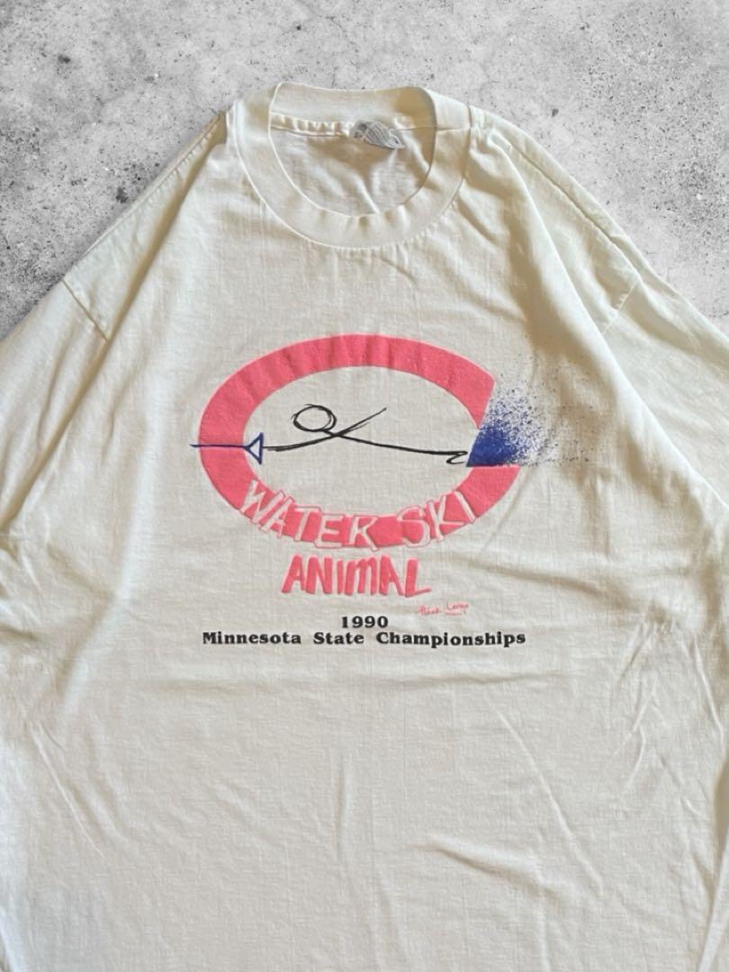 「WATER SKI ANIMAL」と書かれていてその下に英語で1990年ミネソタ州選手権と書かれていますね。水上スキーの大会Tシャツのようです!1990年の大会のようですが、ボディは80sとされているタグが付いています。本当にこの時期が切り替えのタイミングだったんだということが伺えますね。