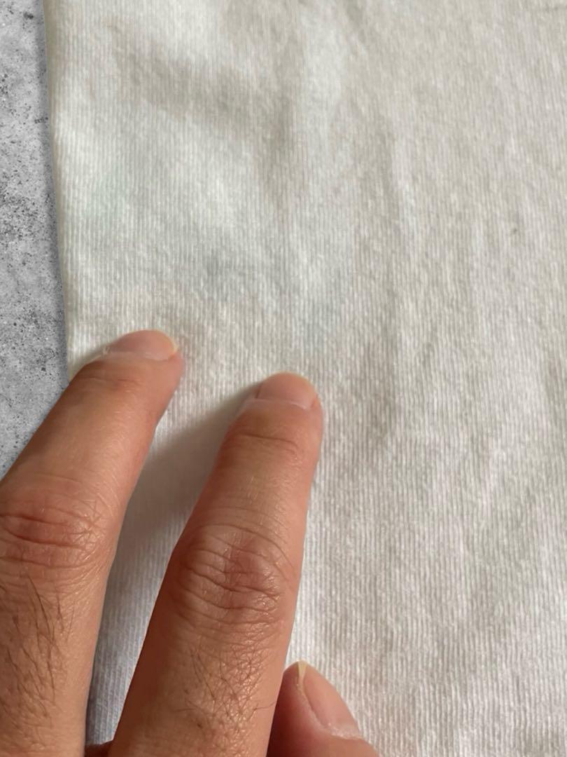 表面、着た際の右腹部に色移りのような薄い緑の着色汚れがございます。写真で指さしております。着る分にはあまり気になりません。その他、汚れ破れ・ホツレ・穴あきなどは見当たりません。