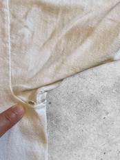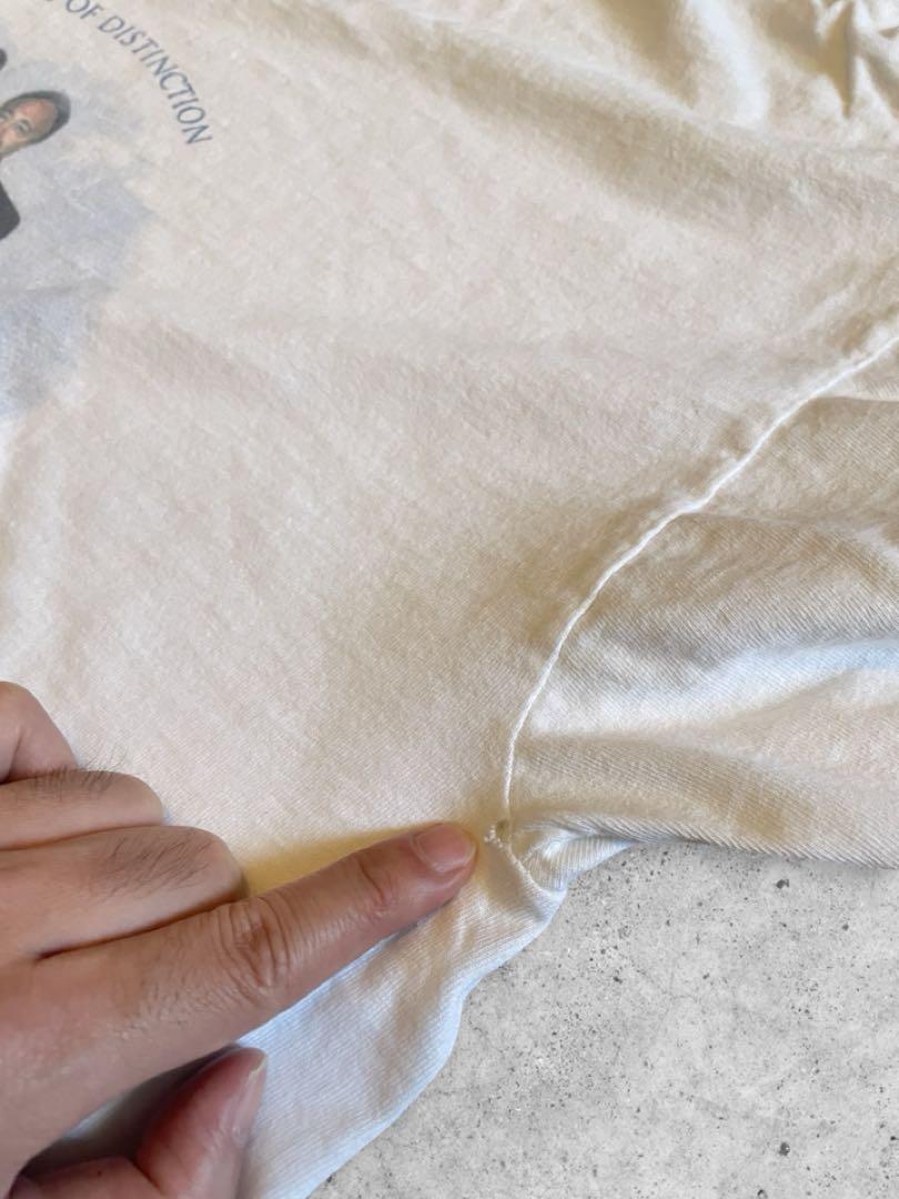 両脇に3mm程度、首のブランドタグ付け根に1mm程度、前面に1mm程度の穴あきがあります。その他、汚れ・破れ・ホツレ・穴あきなどは見当たりません。