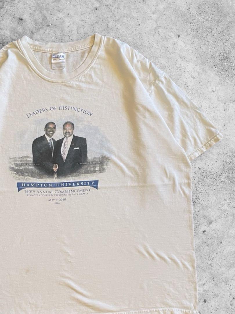 当時アメリカ合衆国大統領だったバラク・オバマ(Barack Hussein Obama II)氏は2010年5月9日、バージニア州ハンプトンのハンプトン大学で卒業式の演説を行いました。その際の記念Tシャツのようです!