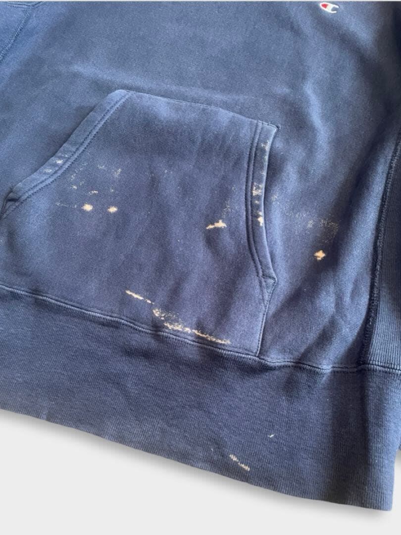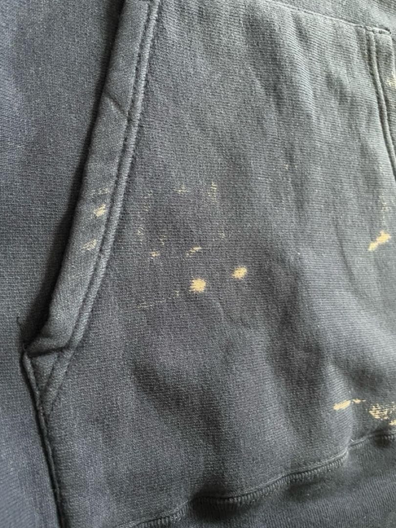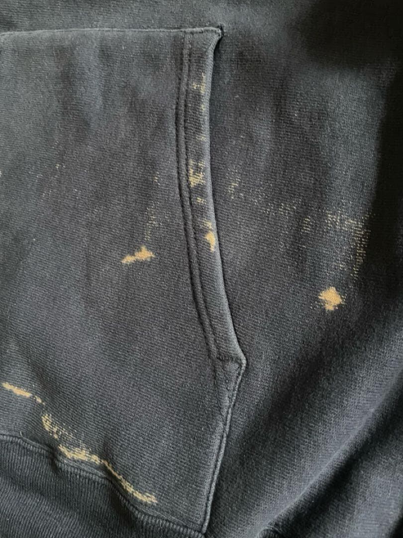 腹部のポケット部分にペンキ痕のような汚れがあります。写真をご参照ください。その他、破れ・ホツレ・穴あきなどは見当たりません。80sリバースウィーブにしては状態も良い方です。