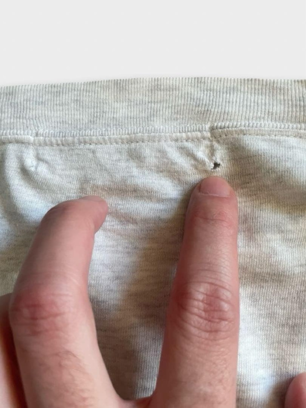 背中側、襟元のタグ部分に小さな穴あきがございます。写真をご確認ください。その他、汚れ・破れ・ホツレ・穴あきなど商品不備は見当たりません。状態を含め安価に出品しております。