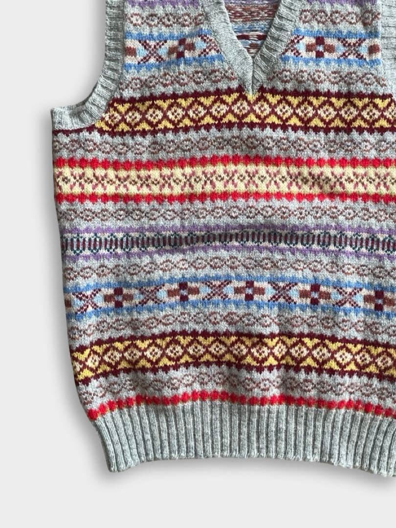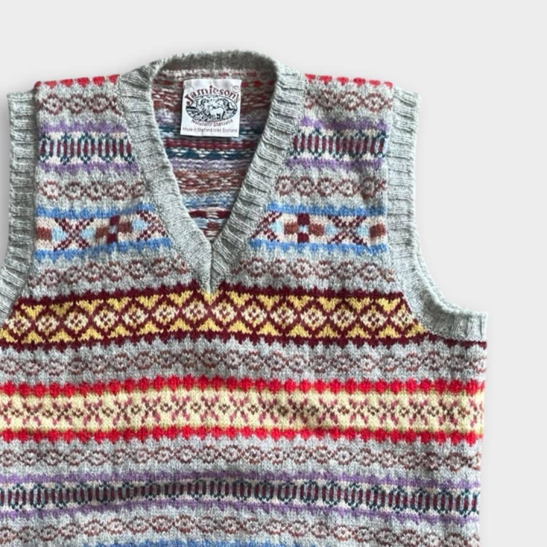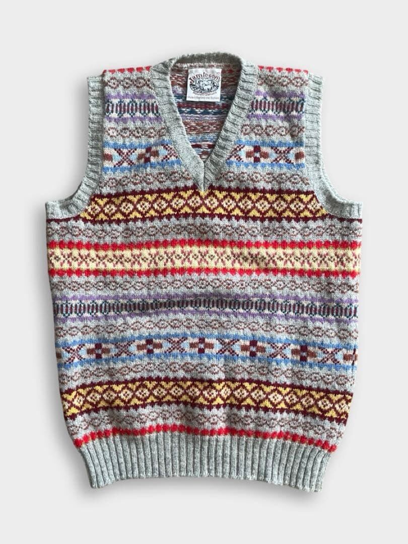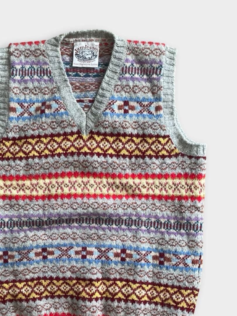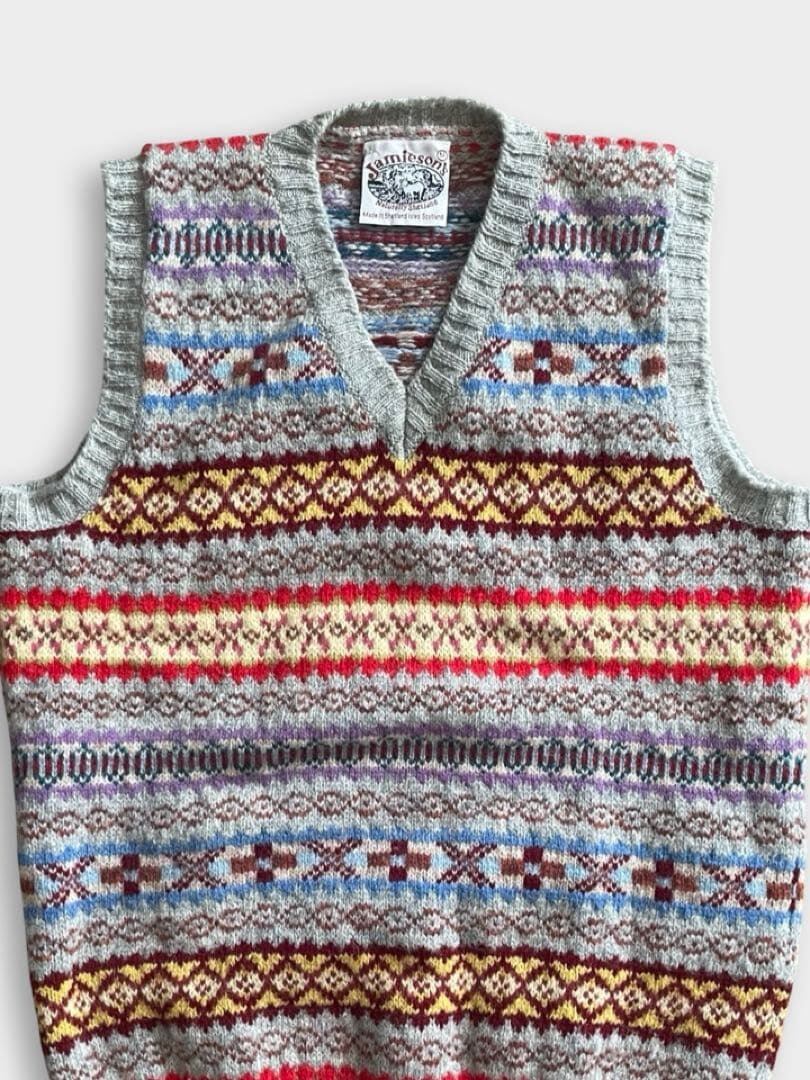 JAMIESON'S(ジャミーソンズ)は、スコットランドのシェットランド諸島で1893年に創業した、現存する最古のニットブランドです。グレーベースのフェアアイルVネックベストです。伝統的なとても良い柄のニットです。