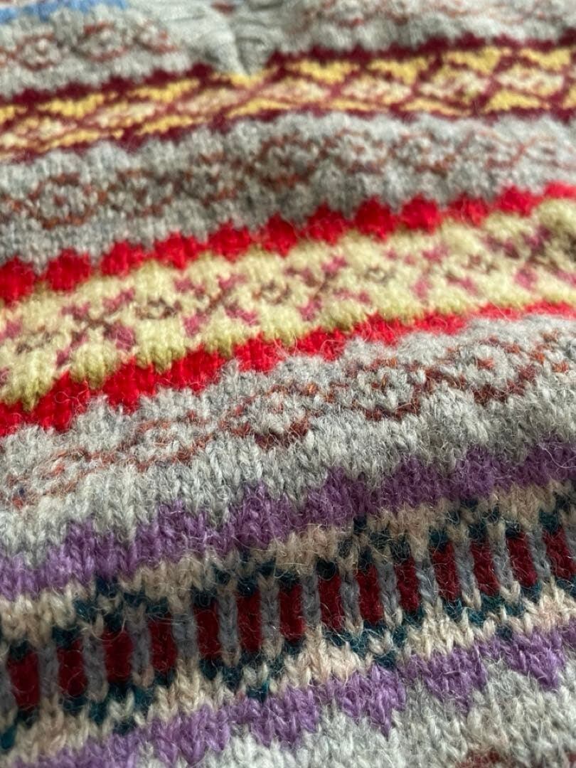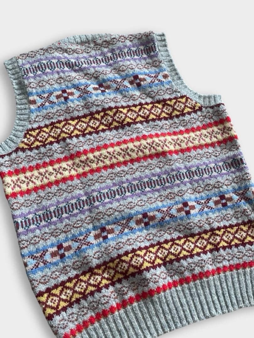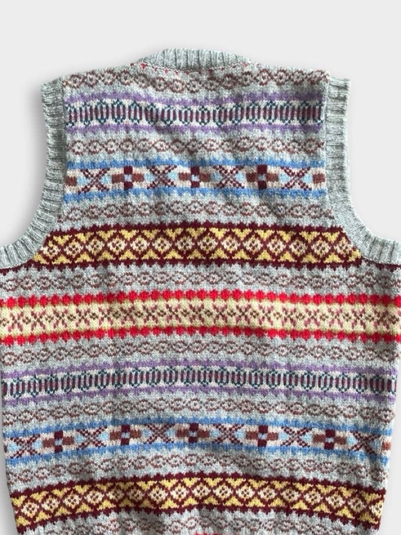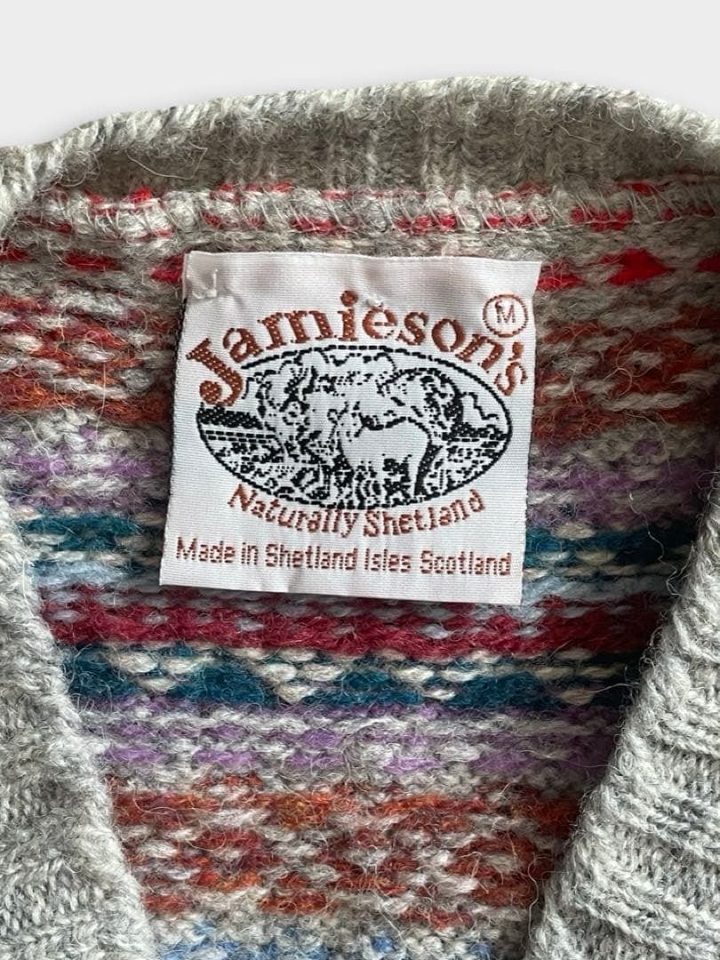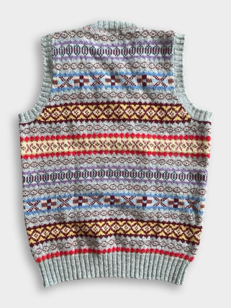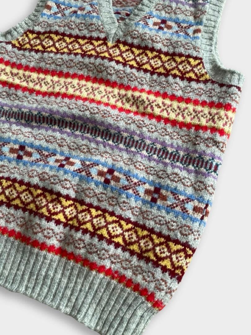 JAMIESON'S(ジャミーソンズ)は、スコットランドのシェットランド諸島で1893年に創業した、現存する最古のニットブランドです。グレーベースのフェアアイルVネックベストです。伝統的なとても良い柄のニットです。
