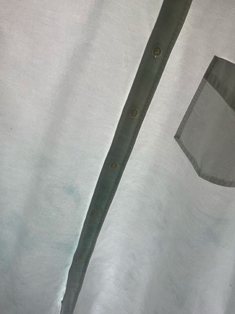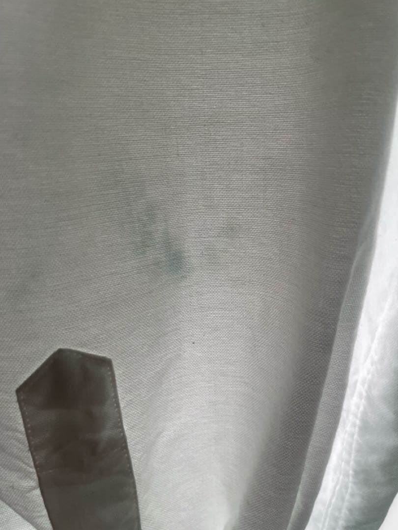 表面・背面、袖などに色移りがあります。写真よりも少し目立ちます。日陰ではあまりわかりませんが、太陽に透かした写真も掲載していますので購入前にご確認お願いします。その他、破れ・ホツレ・穴あきなど商品不備は見当たりません。