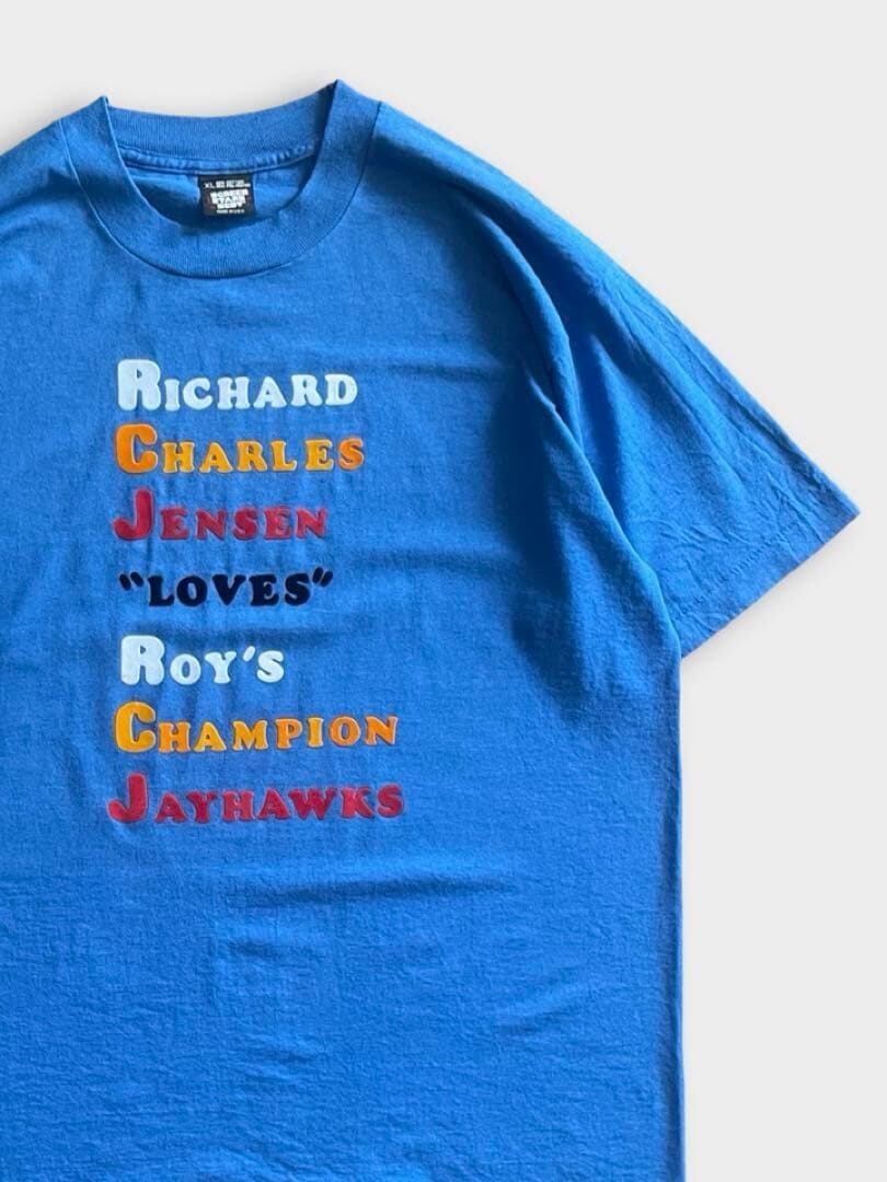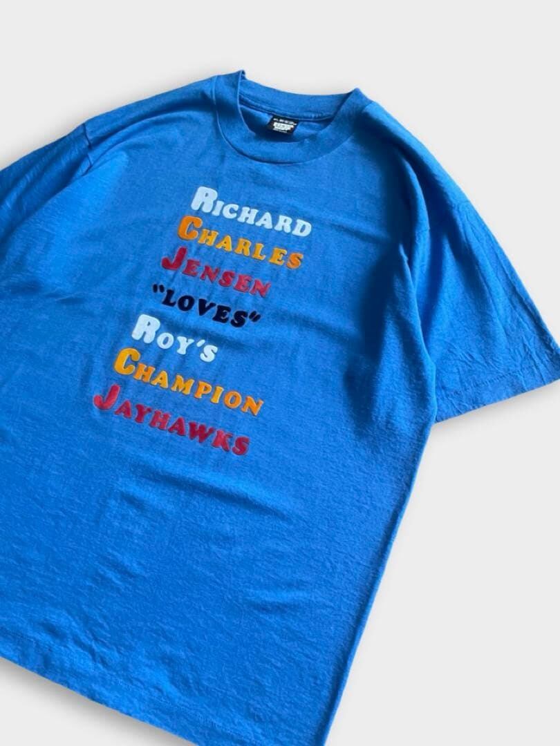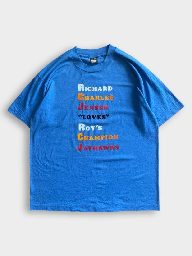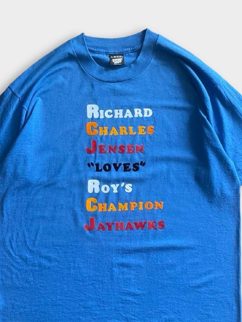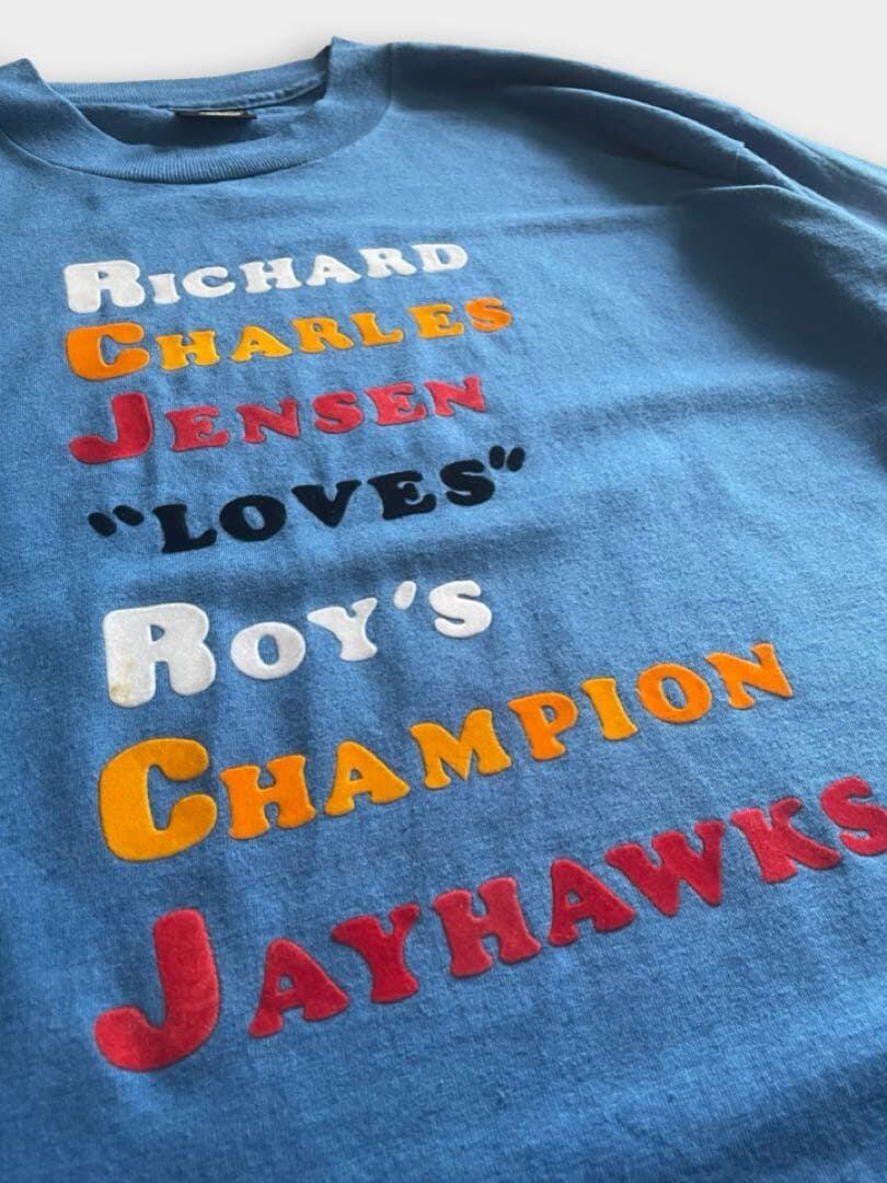 直訳【リチャード、チャールズ、ジェンソンはロイのチャンピオン・ジェイホークスを「愛してる」】意味は分かりませんが、3人の好きなものが一緒的な仲良しTshirtでしょうか。まずデザインに惹かれて仕入れました。