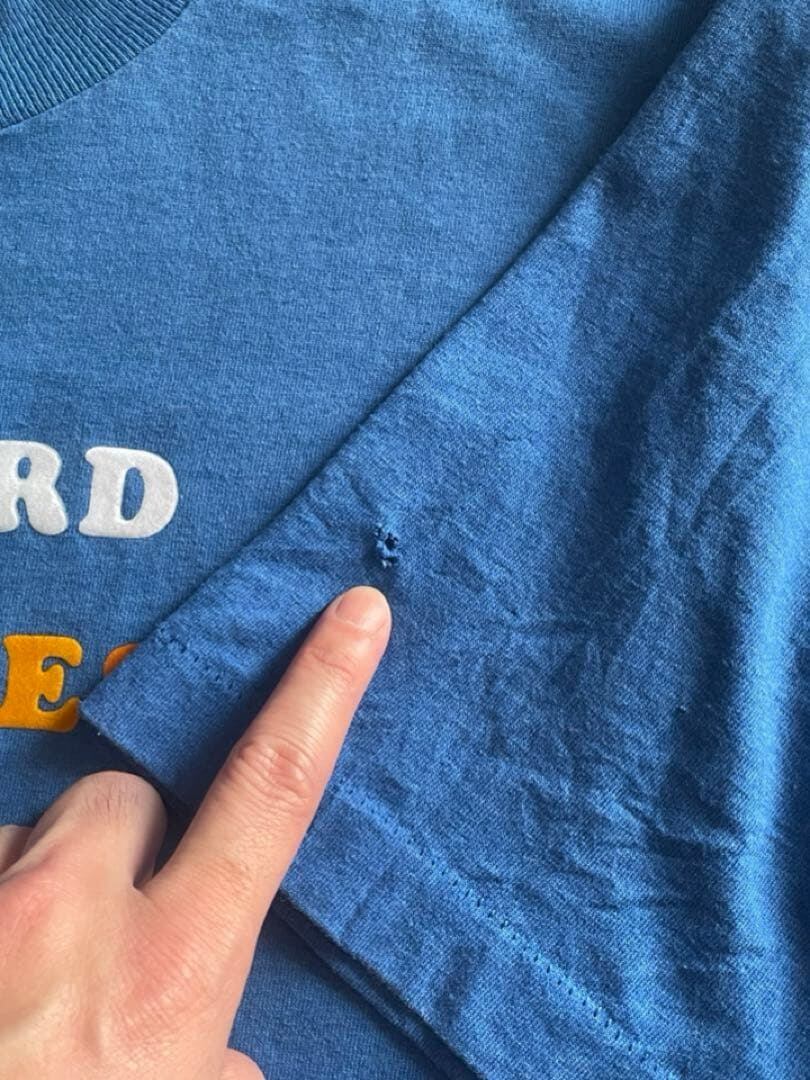 左袖後ろ側に穴あきがございます。また背面に4~5の小さな穴空きがございます。その分価格から割り引いております。汚れ・破れ・ホツレ・穴あきなど商品不備は見当たりません。