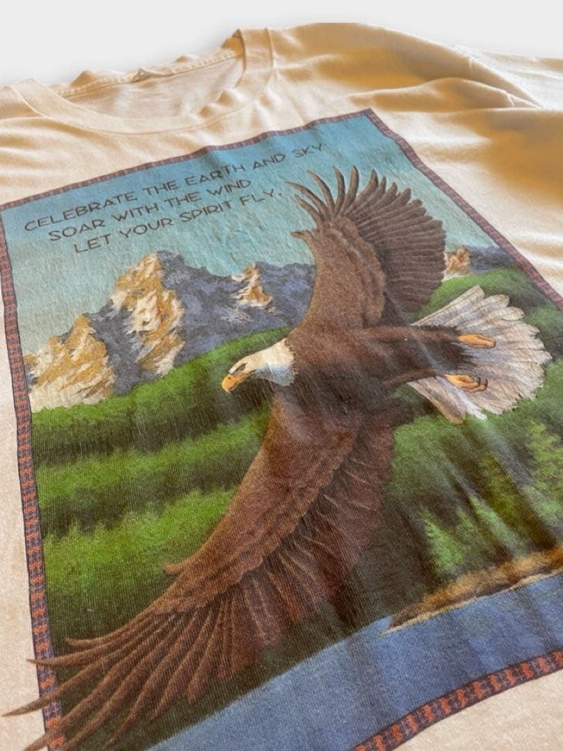 大きなイーグルと背景に大自然が描かれたメッセージTシャツです。