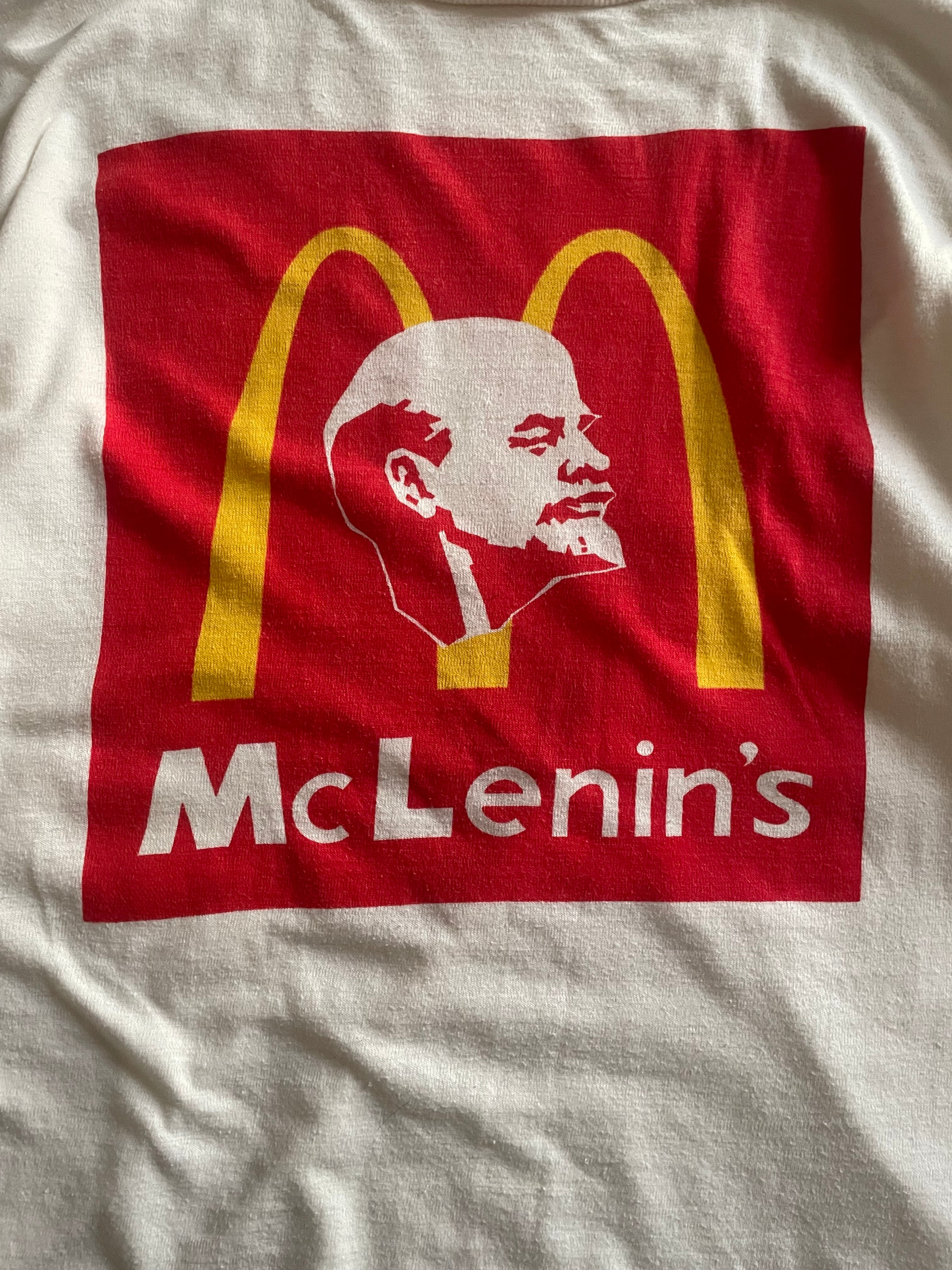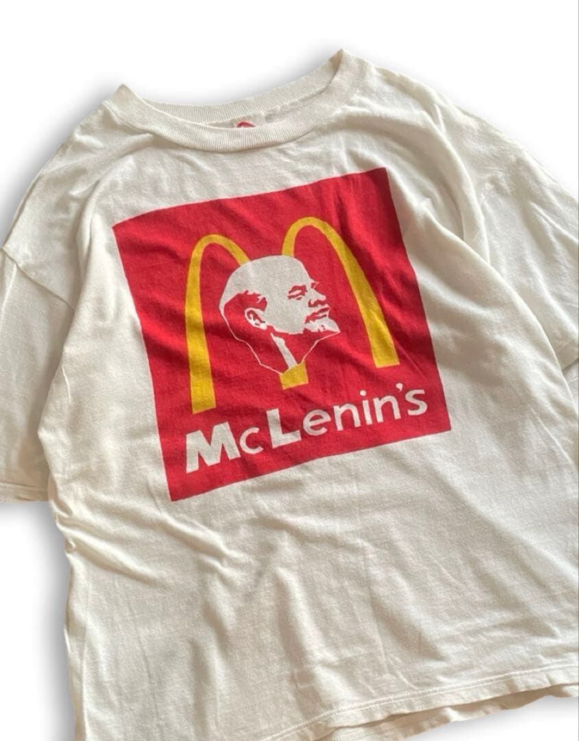 McLenin's(マックレーニン)のTシャツは、旧ソ連初代指導者のウラジーミル・レーニンのイラストと、アメリカ資本主義繁栄の象徴であるマクドナルドのゴールデンアーチがデザインされた