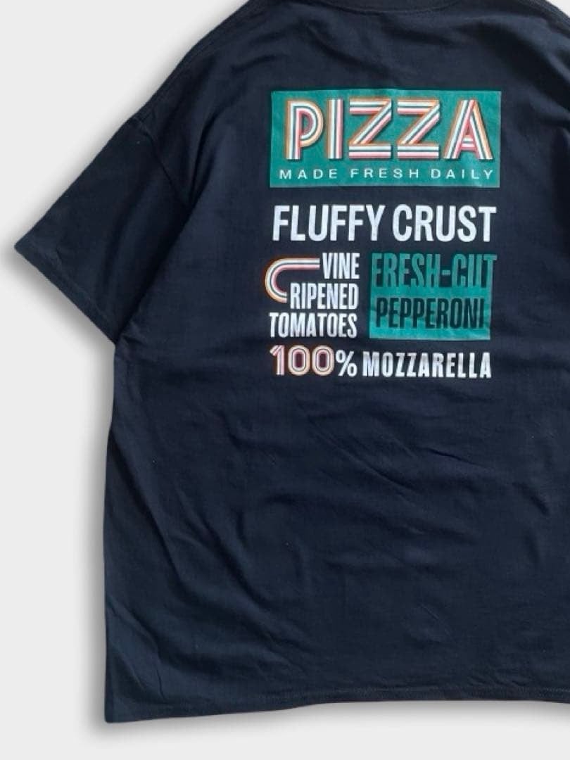 一応企業ロゴ系Tシャツで、日本でもおなじみのコンビニ「セブンイレブン」のアメリカ版Tシャツです。アメリカのセブンイレブンには必ずホットスナックコーナーにカットピザがあるようで、そのピザが大きくプリントされているスタッフTのようです!