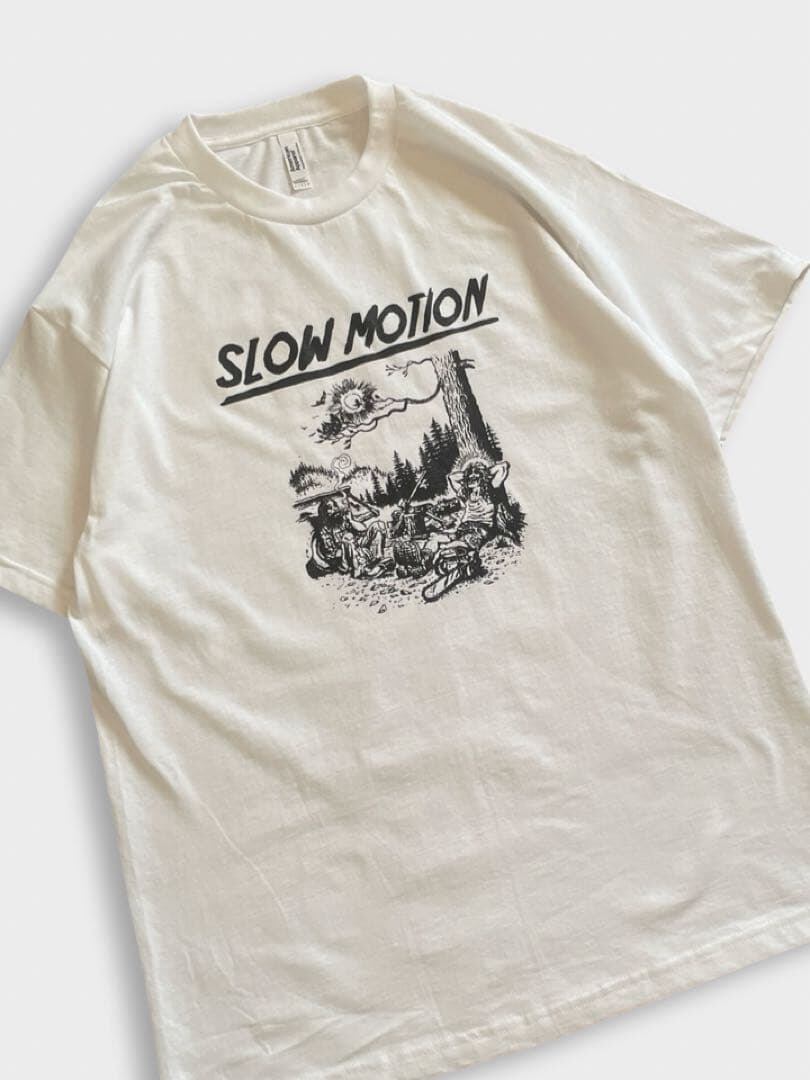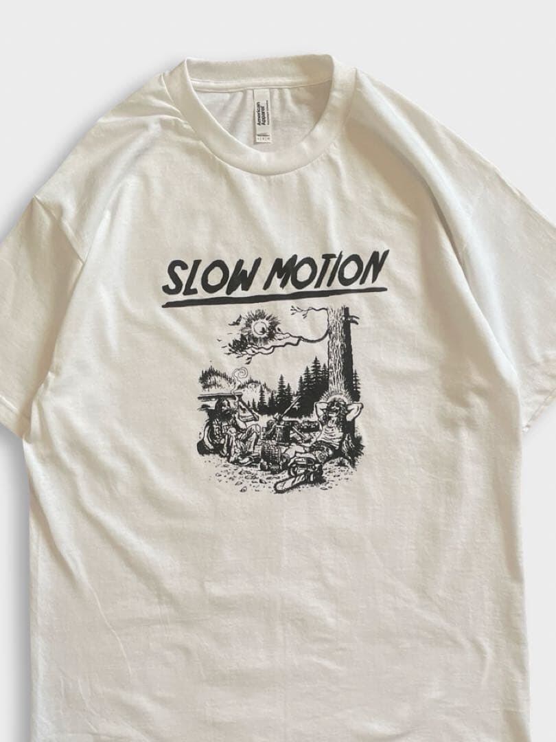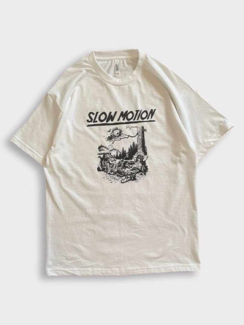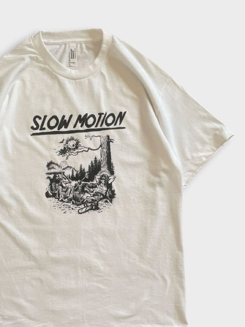 山で伐採作業の休憩中の男二人を描いたグラフィックTshirtです。正直このデザインを制作していた時期は病んでいました・・。スローモーションという文言を選んだ意味も特にないのですが、当時の自分の心中が出た1枚かと思います。