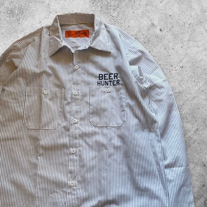 RED KAPのワークシャツの左胸にBEER HUNTERと刺繍が入っております。状態も非常に良く、ワークシャツなのにストライプというのがちょうど良くカジュアルで着やすいです。