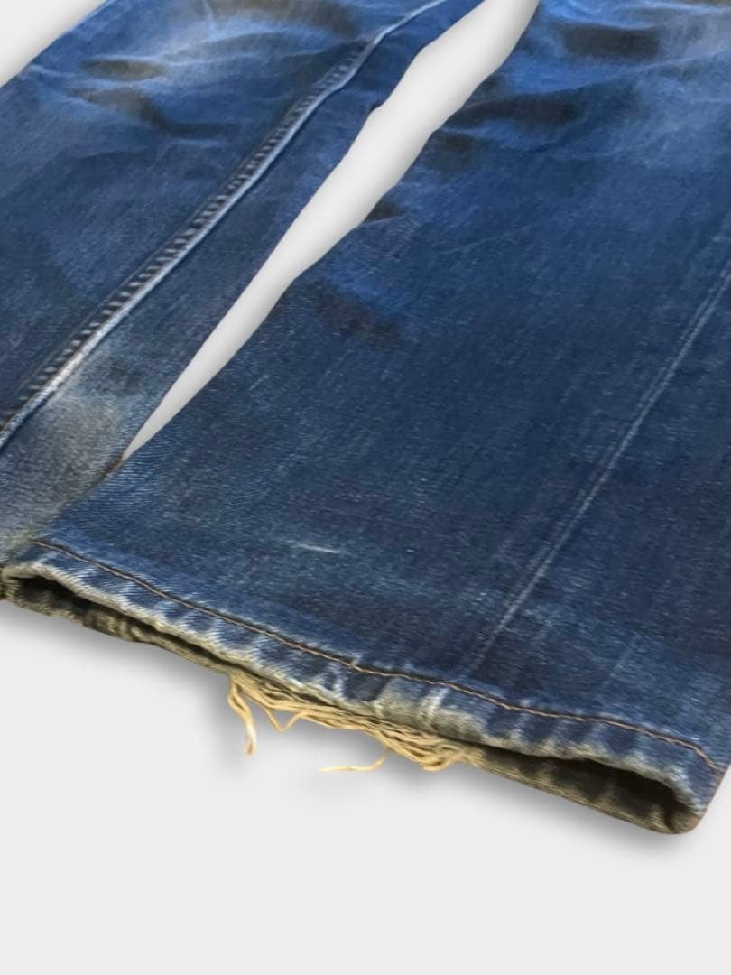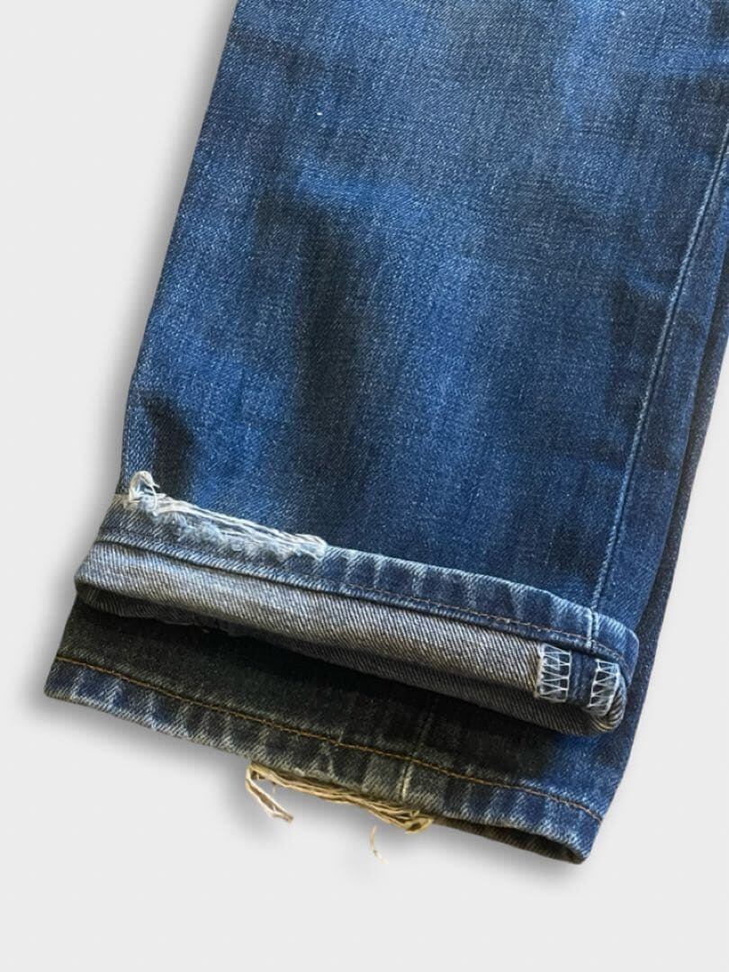 色落ちは若干しておりますが、まだ青みも残っており生地に腰もあるため裾上げなどしてもアタリは出ると思います。裾上げの場合は綿糸での裾上げがオススメです。