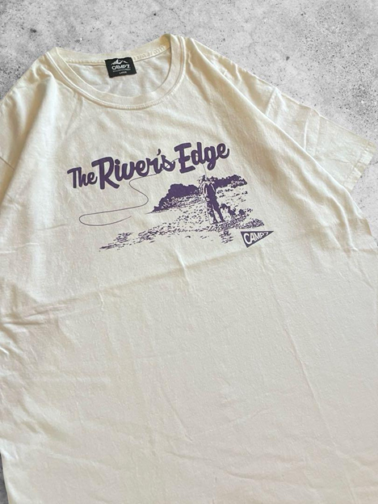 釣りをしているキャンパーのアートワークが描かれており、オールドのプリントTのような雰囲気です。